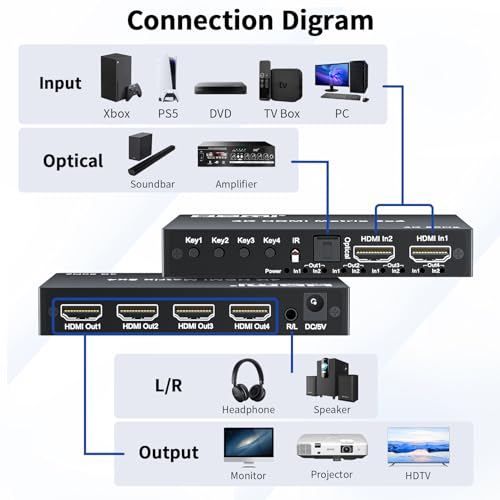 - متوافق على نطاق واسع. يمكن لمنفذ الإدخال توصيل أجهزة مصدر اتش دي ام اي مثل مشغل أقراص VCD/DVD ومشغلات بلو راي واكس بوكس وروكو وفاير تي في وأمازون فاير ستيك بوكس وبلاي ستيشن 3 وبلاي ستيشن 4 وبلاي ستيشن 5 والكمبيوتر وما إلى ذلك. يمكن للمنفذ الخارجي توصيل الشاشة وجهاز العرض والتلفزيون عالي الدقة وغيرها.