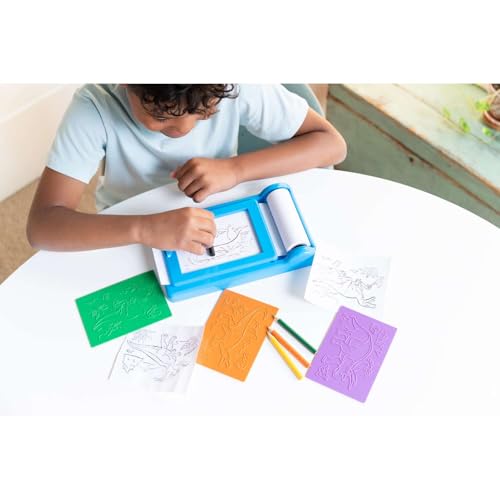 - ابتكر مشهدًا فنيًا من عصور ما قبل التاريخ عن طريق فرك قلم التلوين على لوحات الديناصورات الفنية!
