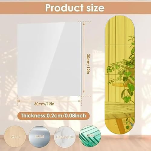 - DIY Freely: There are 4 pieces of acrylic mirror wall stickers in a set, each piece measures about 12x12 inches/30x30 cm, you can buy more than one set for a larger area