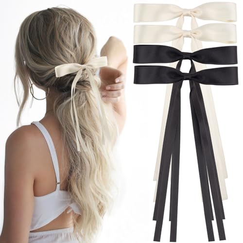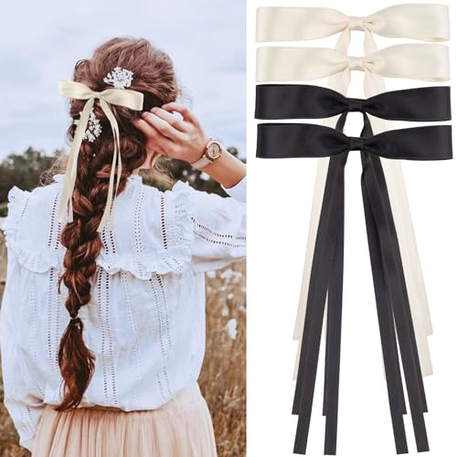 Rolybag - 4Pcs Hair Bows for Women Tassel Ribbon Bow Hair Clips Silky Satin Bow Barrettes Hair with Long Tai Ribbons Bows Clips for Ponytail Holder Cute Bows Hair Accessories for Women Girls Teens (Black,Beige)
