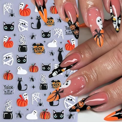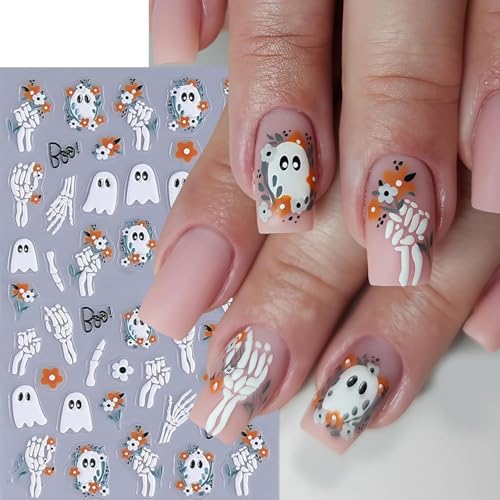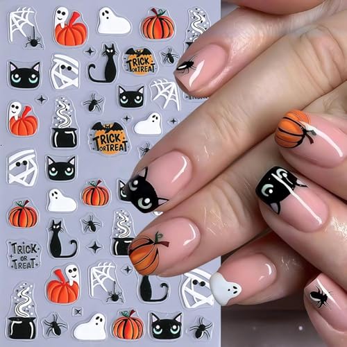 fashion mania - 4Pcs Halloween 5D Embossed Nail Stickers Cute Ghost Nail Decals Self-Adhesive Pumpkin Spider Web Flower Ghost Nail Design Cats Skeleton Hand Nails Decorations Halloween DIY Manicure Supplies for Women