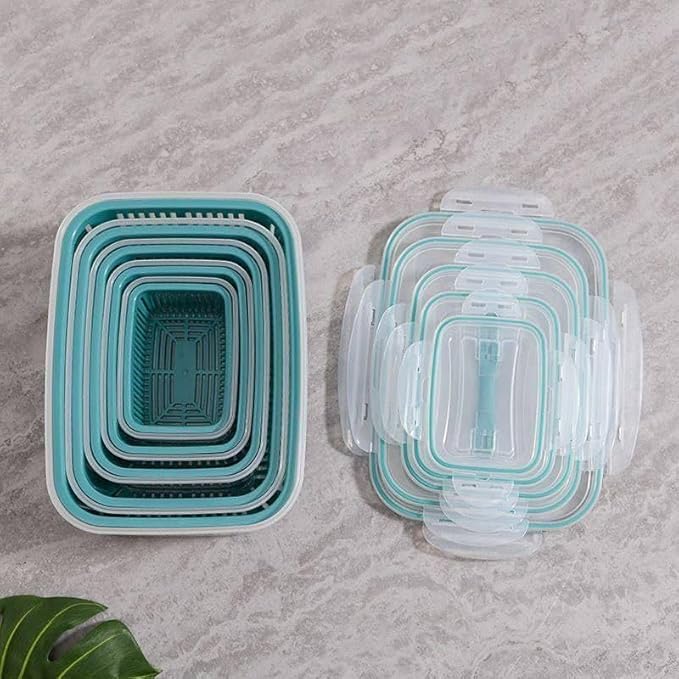 - SET OF 5 FOOD STORAGE CONTAINERS: Fresh Plastic Food Container Set 5 Lids 5 Different Size Containers 5 Colanders (24.5 Cups + 16.1 Cups + 9.7 Cups + 5.7 Cups + 3 Cups). Different capacity makes storage easier
