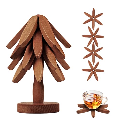 TOWEBOORY - 5 قطع من الركائز الخشبية للاطباق الساخنة، مجموعة مفارش على شكل شجرة الجوز للاواني الساخنة والمقالي، 5 حوامل خشبية + 1 حامل، وسادات مقاومة للحرارة قابلة للطي لمقالي ابريق الشاي وطاولة المطبخ (لون خوخ)