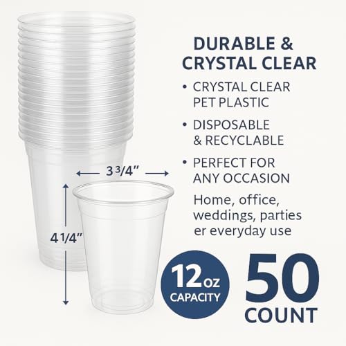 - Value Pack of 50 Cups – Get 50 high-quality 12 oz cups in every pack—perfectly sized for medium servings at events or daily use. Rolled Wall Rim- Will not hurt as you are drinking your favorite drink, iced coffee, water, smoothies and much more