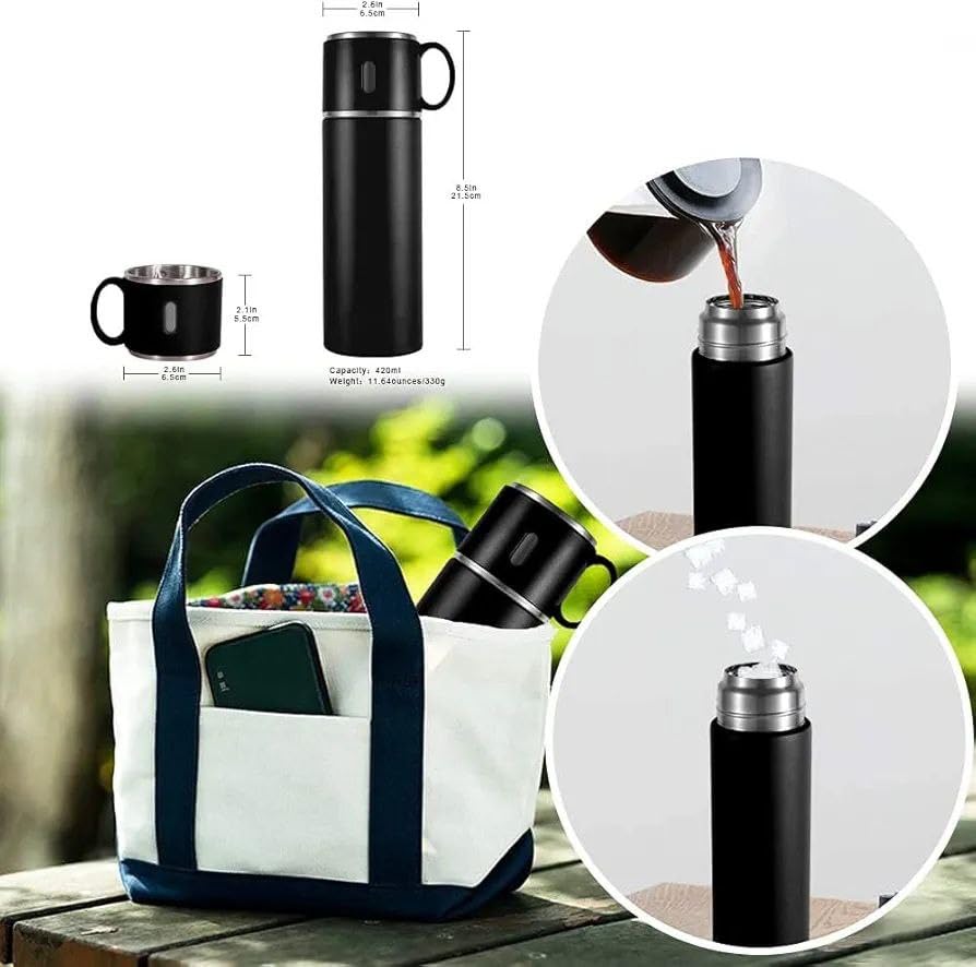 Generic - 500ml Double-Wall Stainless Steel Thermal Bottle Set with 3 Matching Cups – Original 304 Food-Grade Steel, Long-Lasting Heat & Cold Retention, Perfect for Travel, Work, and Outdoor Use (Black 1 Piece)