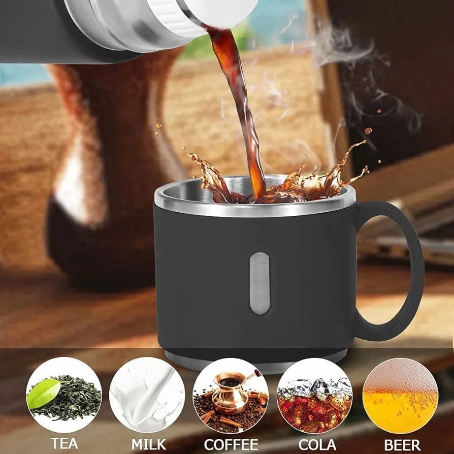 - COMPLETE SET WITH 3 STAINLESS STEEL CUPS – Comes with three matching stainless steel cups, making it easy to share drinks anywhere you go. Ideal for family outings, picnics, road trips, or gatherings. The cups are durable, hygienic, and easy to clean, providing a convenient and practical way to serve beverages in any environment.