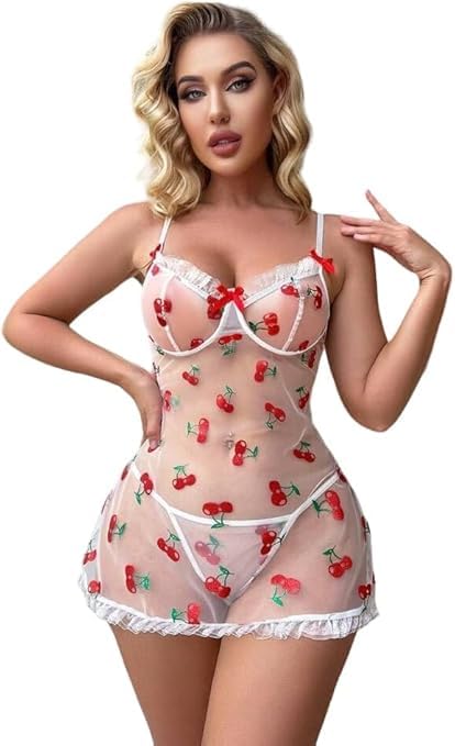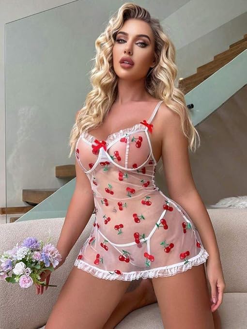 Generic - لانجري بيبي دول مشجّر كرز بفيونكات حمرا ، لانجرى قصير بحافة كشكشة شيك، حمالات رفيعة ، متناسق لإطلالة أنثوية جذابة من كيان للتجاره والتوزيع كود 549