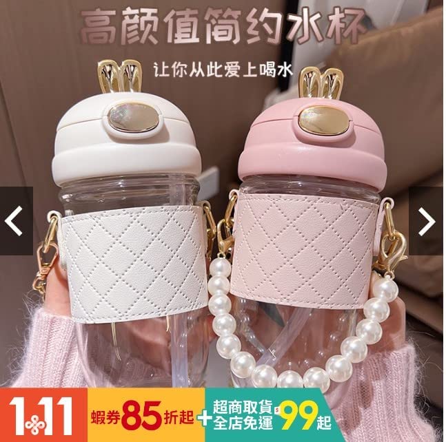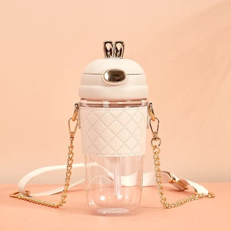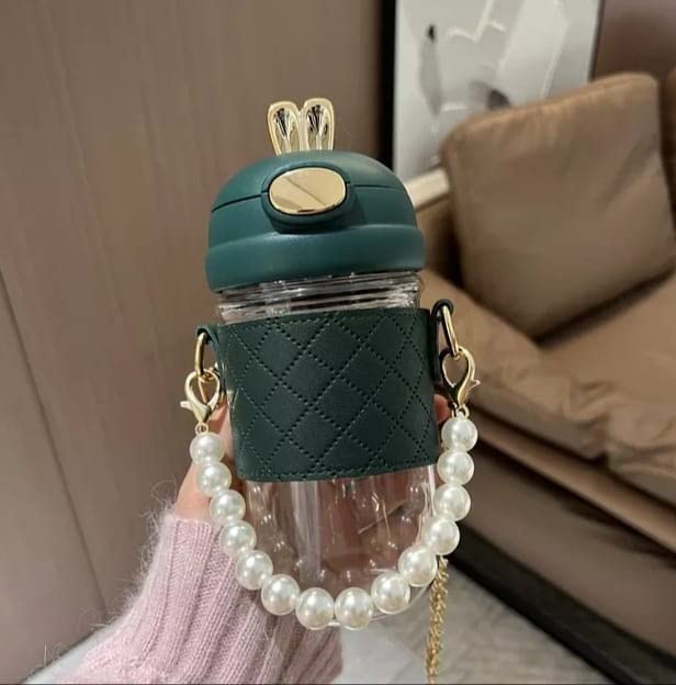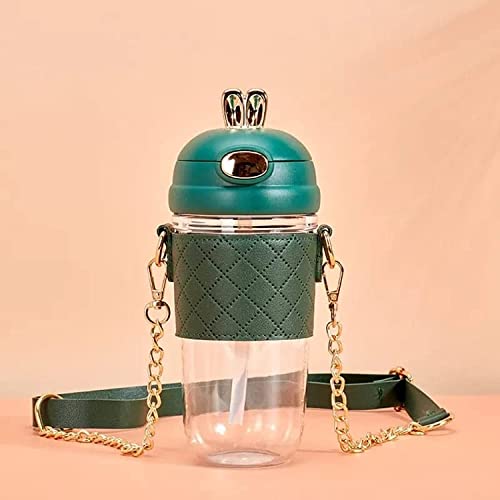 Spaceshoop - زجاجة مياه بلاستيكية عصرية بشفاطة خالية من البيسفينول ا بسعة 550 مل، بتصميم اذني ارنب ظريفتين للاطفال، محمولة بحزام مع سلسلة من اللؤلؤ للاطفال والطلاب، اخضر