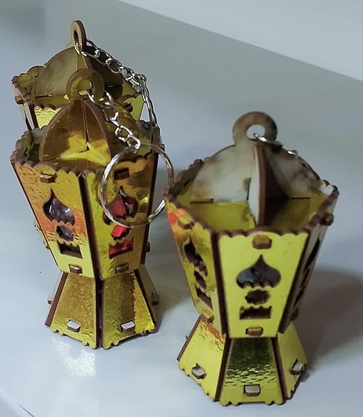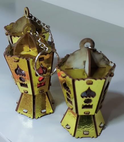 Generic - عرض 6 قطع من طقم سلسلة مفاتيح فانوس رمضان خشبي، مقاس 10 سم بوحده اضائه خمات عاليه الجوده ، تصميم نجمه وهلال ، هدية زخرفية للعطلات، حلقة مفاتيح معدنية متضمنة بلون دهبى