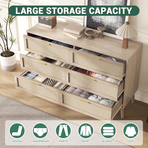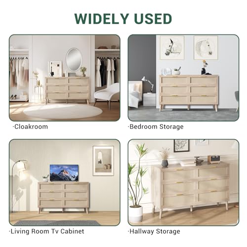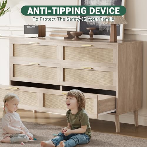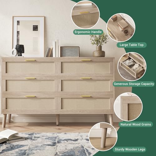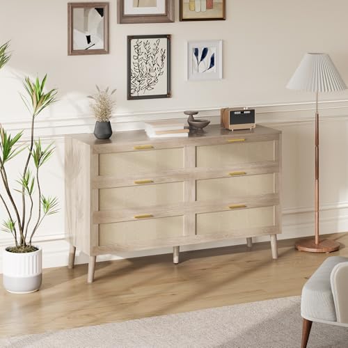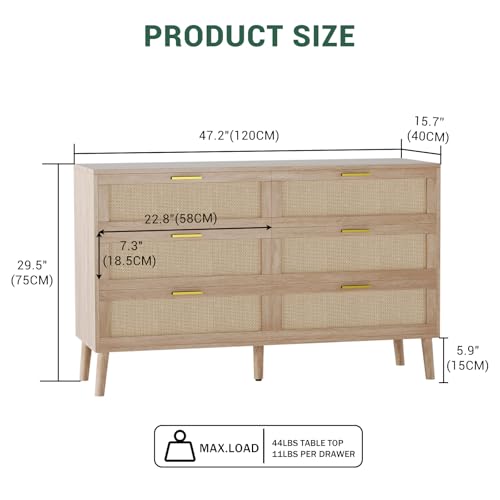Curtainboro - خزانة راتان من 6 ادراج، 47.2 انش × 15.7 انش × 29.5 انش، خزانة عصرية بتصميم منتصف القرن للخزانة مع مقابض، سطح طاولة كبير لغرفة النوم وغرفة المعيشة والرواق والمدخل