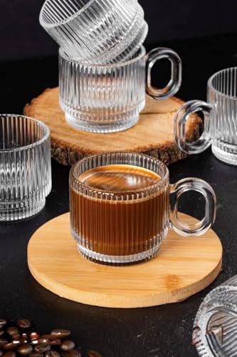 Generic - 6 PACK Ribbed Glass Espresso Cups & Turkish Coffee Mugs Set - Small Clear 3oz (90ml) Coffee Cup with Handle - Vintage Striped Glass Mugs for Double Shot, Cortado & Arabic Coffee