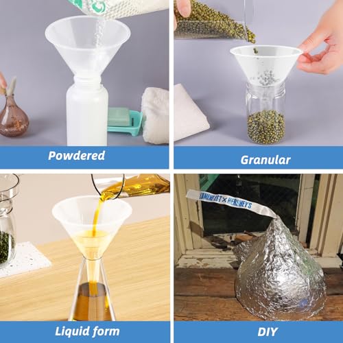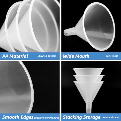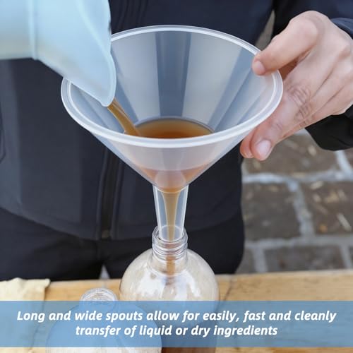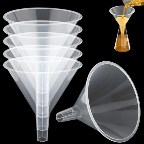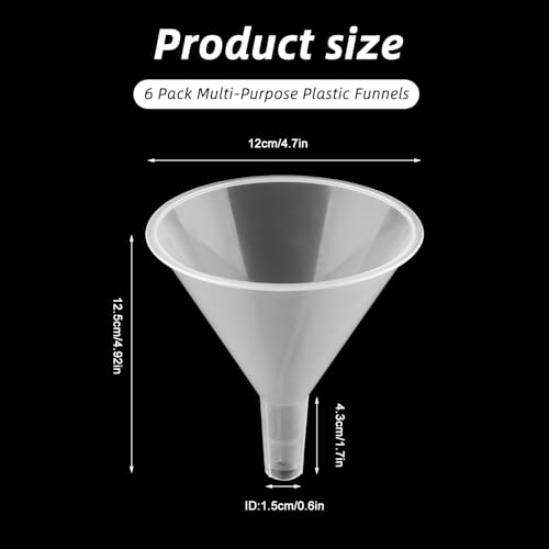 - 6-Pack Value Set: Includes 6 clear PP plastic funnels (4.7" top diameter) with extended 0.6" spouts – designed for filling multiple bottles or storing spares in kitchen, garage, and travel kits.