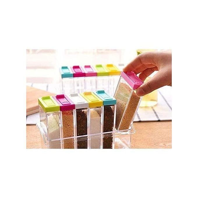 Generic - طقم برطمانات توابل اكريليك من 6 قطع مع رف منظم واغطية بلاستيكية لطاولة المطبخ وطاولة الطعام، سهلة الوصول والتخزين بشكل انيق