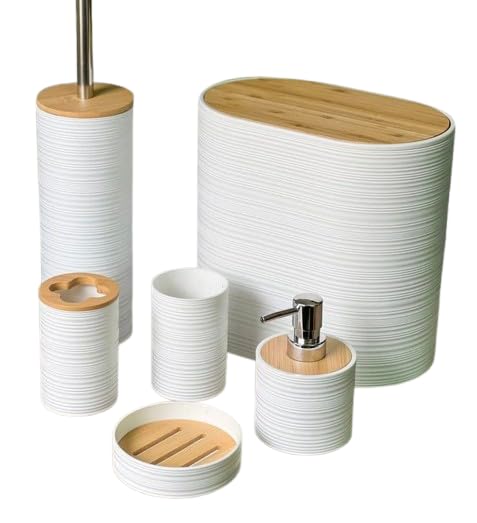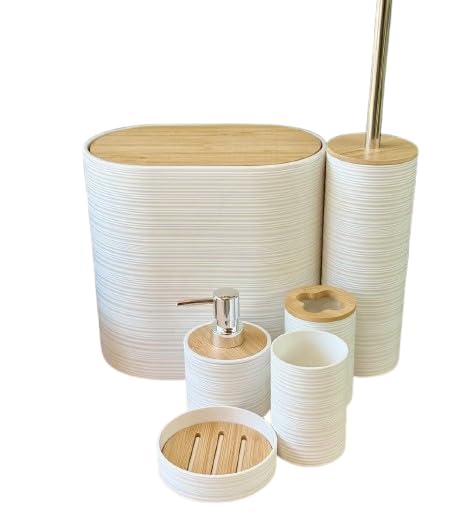 Generic - طقم حمام ديكوري بيضاوي فاخر 6 قطع – منظم متكامل بلمسة خشبية أنيقة – يشمل سلة نفايات بغطاء قلاب، حامل فرش أسنان، ديسبنسر صابون سائل، (أبيض)