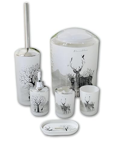 - يشتمل طقم الحمام البلاستيك المطبوع ذو الطراز الاسكندنافي هذا على ست قطع أساسية: زجاجة لوشن، وحامل فرشاة أسنان، وكوب غرغرة، وصبانة، وسلة مهملات، وفرشاة تواليت، مما يضمن تنظيمًا كاملًا وديكورًا أنيقًا.