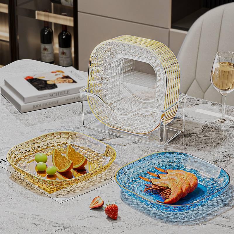 Generic - 6 Pieces Plastic Embossed Plate Set with Storage Holder Crystal Gold Blue Design 14.5x14.5x2cm for Kitchen and Serving