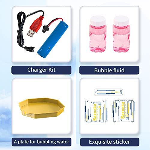 - المواد والاكسسوارات: مسدس فقاعات كبير مصنوع من بلاستيك ايه بي اس الصديق للبيئة، ويحتوي الصندوق على 2 × سائل فقاعات، 1 × صينية، 1 × بطارية 3.7 فولت، وشاحن. تم اجتياز اختبار السلامة ومتوافق مع معايير الألعاب الأمريكية.