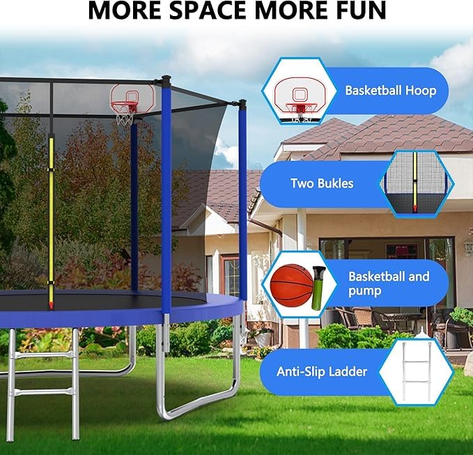 - 2. Safe design: our trampoline has undergone rigorous safety inspections with 6 foam padded poles and a high-quality zip housing for maximum safety. The jumping pad uses an 8-thread sewing technology that significantly improves the stability of the trampoline