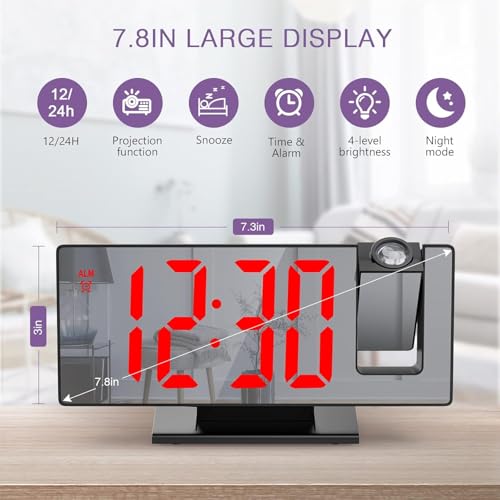 Generic - 7.8 Inch LED Display Alarm Clock with Projector, Digital Mirror Clock with USB Charging Port Adjustable Brightness Snooze for Home Bedroom Office (Red Light)