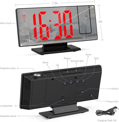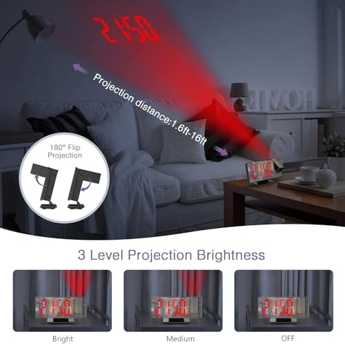 - 1 x Hour with 180 degree projector and 3 levels of brightness: the alarm project will run with the touch of a button and supports 180°rotation with choose 3 levels of projection brightness (closed, medium, bright), the projection distance is 1.6-16 feet..
