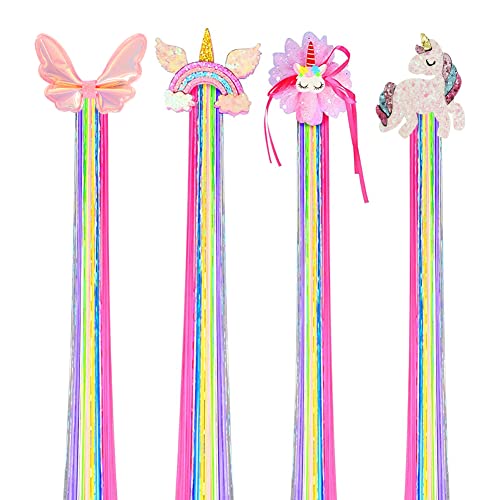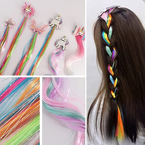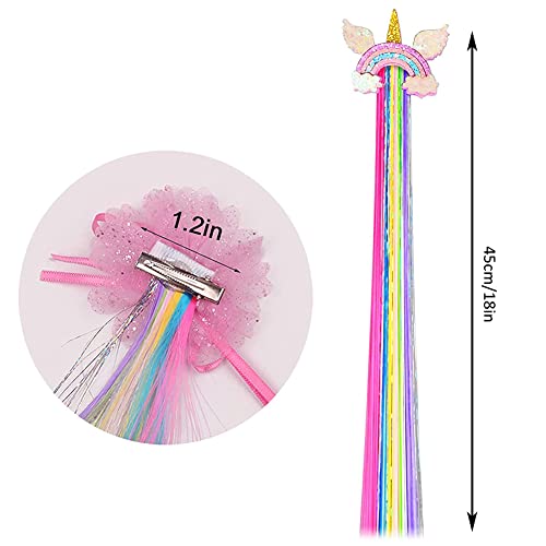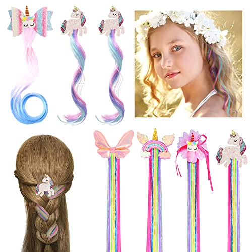- You will get 7 pieces unicorn bows clips are designed with dreamy elements, can be directly clipped to the hair. The colored hair extension part can be braided with the child's real hair. The wig blends perfectly with the hair, so you can have color highlights without dyeing hair.