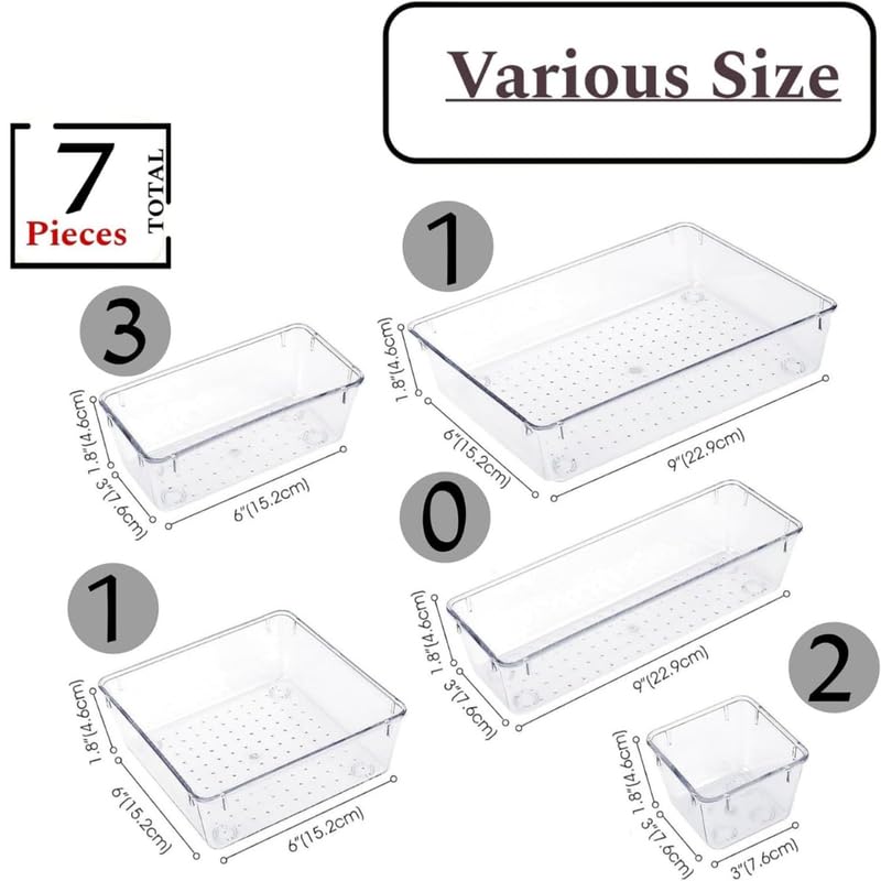 Daga - مجموعة منظم ادراج بلاستيكية شفافة مكونة من 7 قطع، صناديق تخزين معيارية متعددة الاستخدامات، صواني متعددة الاستخدامات لمستحضرات التجميل وادوات المطبخ والمجوهرات واللوازم المكتبية
