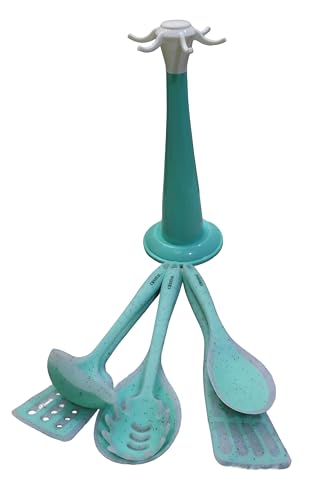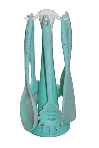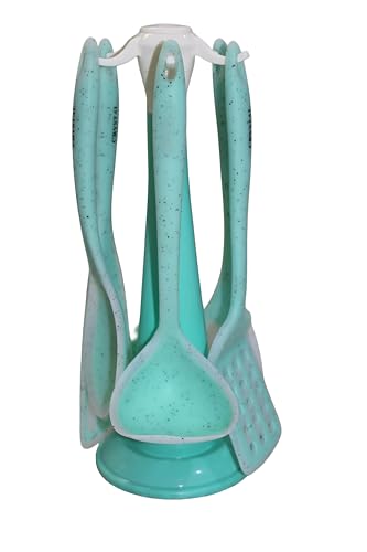 - Set Contents: Includes 7 Pieces - Soup Spoon, Scoop , Spaghetti Spatula, Cooking Spatula, Holes Spatula , Strainer, Spatula Food Spinner with Stand for Kitchen Tools Organizer