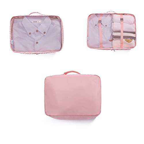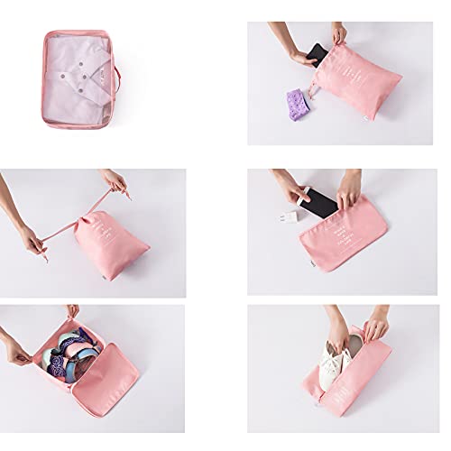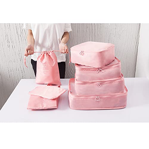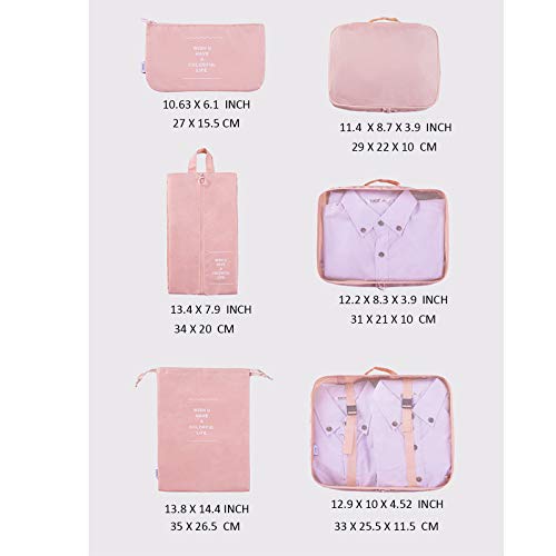 - 7PIECES TRAVEL LUGGAGE ORGANIZERS of different compression cell sizes get all your item types covered. Pack more of your luggages in limited space with different sizes, large bags for sweater, T-shirts, pants, medium bags for towels and underwear, small bags for shoes, toiletry and accessories respectively. Get organized and unpack convenience right away.