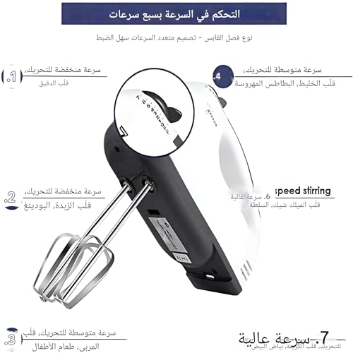 - إحدى الميزات البارزة لمضرب البيض الكهربائي هو إعدادات السرعة السبعة المختلفة. يتيح لك هذا التنوع اختيار السرعة المثالية لاحتياجات الخلط الخاصة بك، سواء كنت تخفق بياض البيض إلى درجة الكمال أو تعجن العجين لمنتجاتك المخبوزة المفضلة. بفضل هذا المستوى من التحكم، يمكنك تحقيق القوام والملمس المطلوبين في وصفاتك بكل سهولة.
