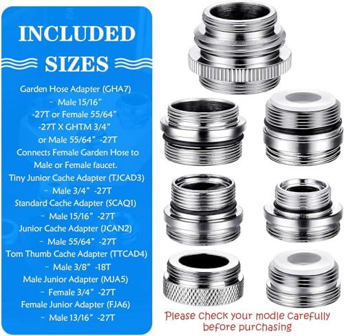 - 3. 7 Sizes Cover 10+ Common Threads:Includes adapters for nearly every sink: Tiny Junior Cache (3/4”-27T), Standard Cache (15/16”-27T), Garden Hose Dual-Thread (Image 4), and Tom Thumb (3/8”-18T). No guesswork—even if you’re unsure of your faucet’s specs, the variety guarantees a match (see Image 4’s size list). Saves you from buying multiple single-adapters.