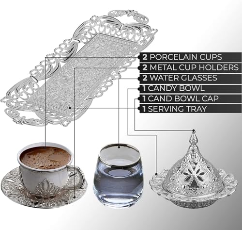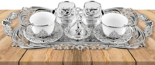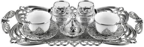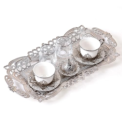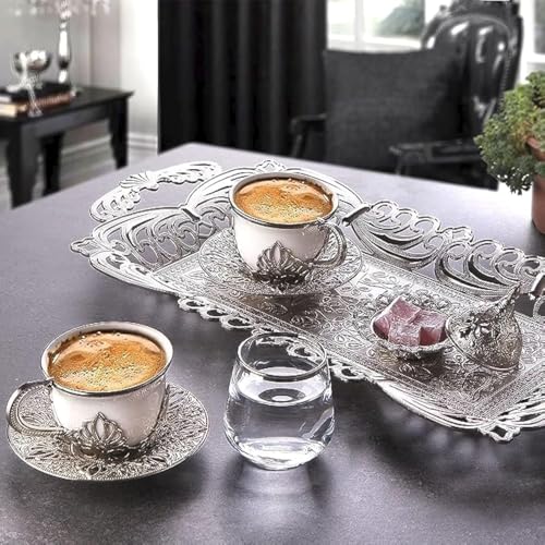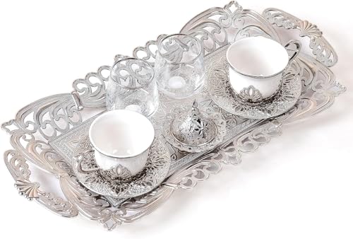 Home and Kitchen Art - طقم قهوة مزدوج للتقديم ابيض عدد 8 قطع ( 2 فنجان بالحامل + 2 طبق فنجان + 2 كوب زجاج +تمرية بالغظاء + صينية) سعة 80 مللى لتر H&k Art