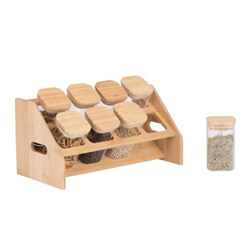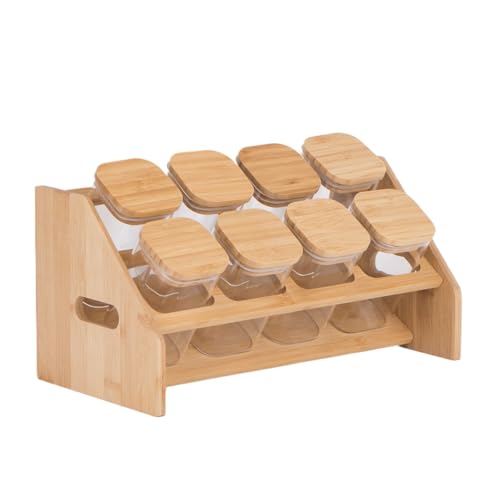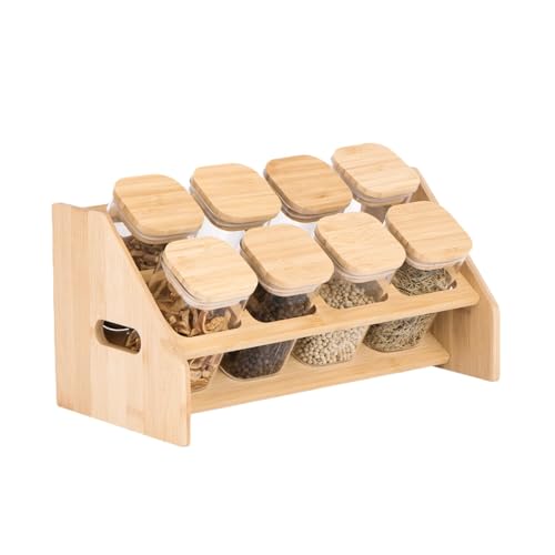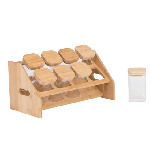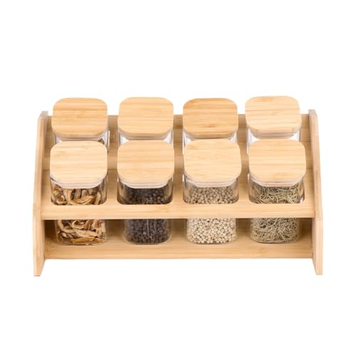- [COMPLETE & ELEGANT KIT]:The seasoning set includes 8 large square glass jars with wooden organizer stand, giving your kitchen a tidy and practical look with a modern decorative touch.