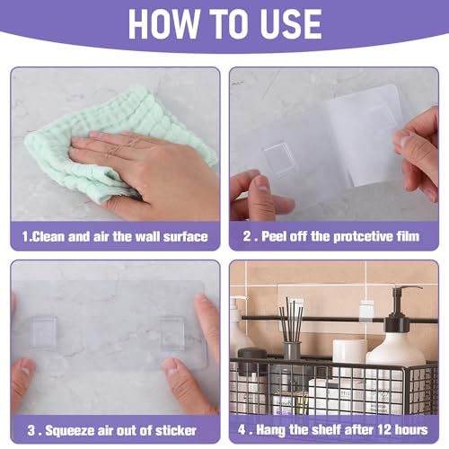 - 【Easy to Use】 No extra tools, just tear off the waterproof adhesive shelves stickers's rubber cover and sticker, press the hook on the wall, keep it dry and wait for 24 hours to use. Warm tips: the shower caddy adhesive replacement on the wall can only be used once!