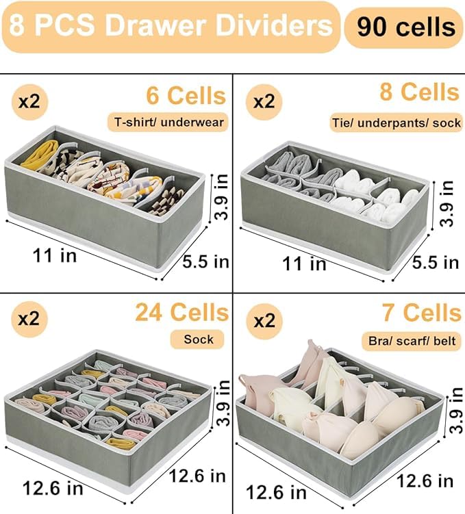 - 【منظم أدراج في 4 مقاسات】تتضمن مجموعة منظم الملابس المكونة من 8 قطع 2 × 6 مساحات تخزين لتنظيم التيشيرتات/الملابس الداخلية، 2 × 7 مساحات تخزين لحمالات الصدر / الأوشحة / الأحزمة / ملابس الأطفال ، 2 × 24 مساحة تخزين لتنظيم الجوارب ، 2 × 8 مساحات تخزين لتنظيم ربطات العنق / السراويل الداخلية.