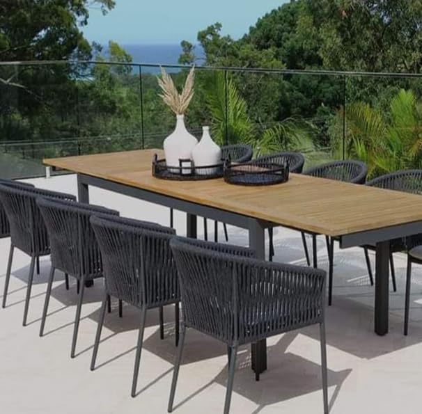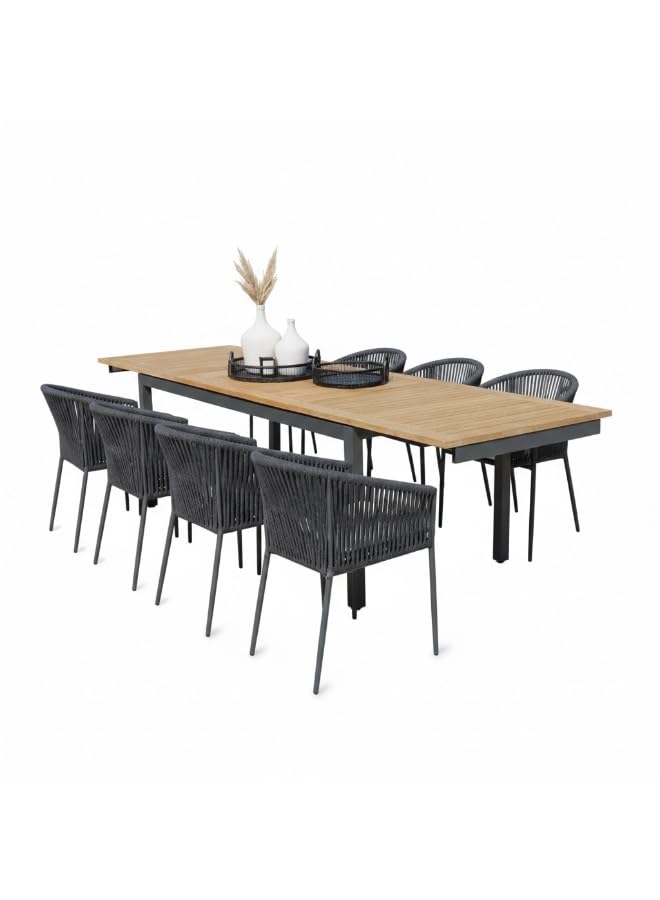Generic - 8-Seater Outdoor Rope Dining Set with Wooden Top, Modern Design, Metal Frame with Woven Rope Chairs, Jacquard Cushions