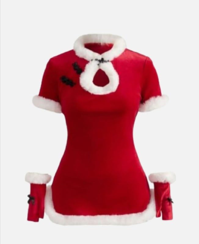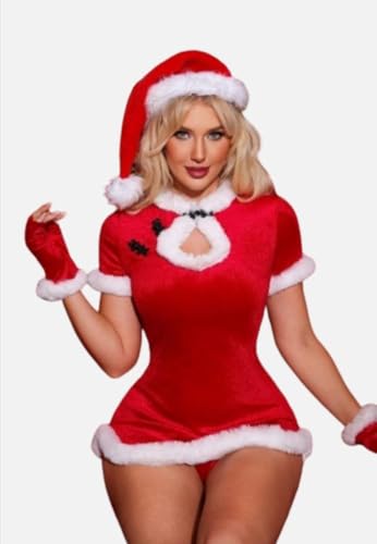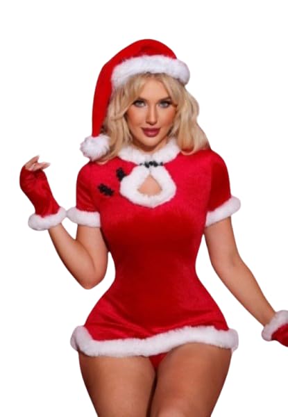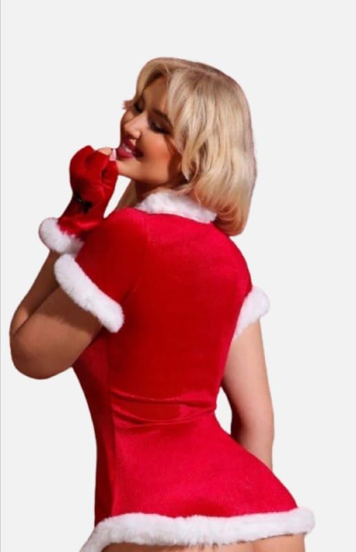 هنادي - قميص نوم تنكري كريسماس قطيفة احمر مع طاقية وجوانتي فرو ابيض – ساوان سايز حتى 80 كيلو – HN 9010