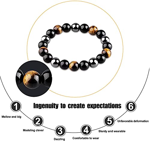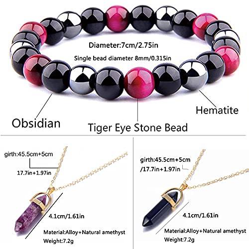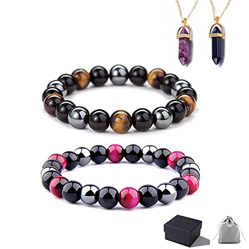 HEFFY - زوج من الاساور للرجال والنساء مصنوع خرزات ذات حماية ثلاثية بحجم 8 ملم احجار الهيماتيت والسبج وعين النمر مع قلادة بدلاية حجر السبج أسود