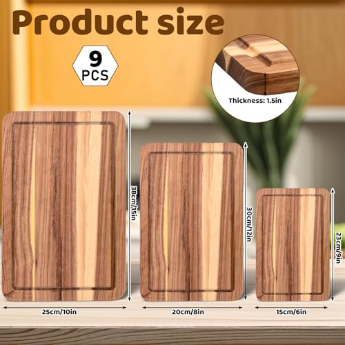 Kaxtde - 9 PCS Wood Chopping Board Set, Acacia Cutting Boards with Juice Grooves, Kitchen Wooden Charcuterie Board for Meat Vegetables Cheese Fruits Meal Prep & Food Serving (3 Sizes)