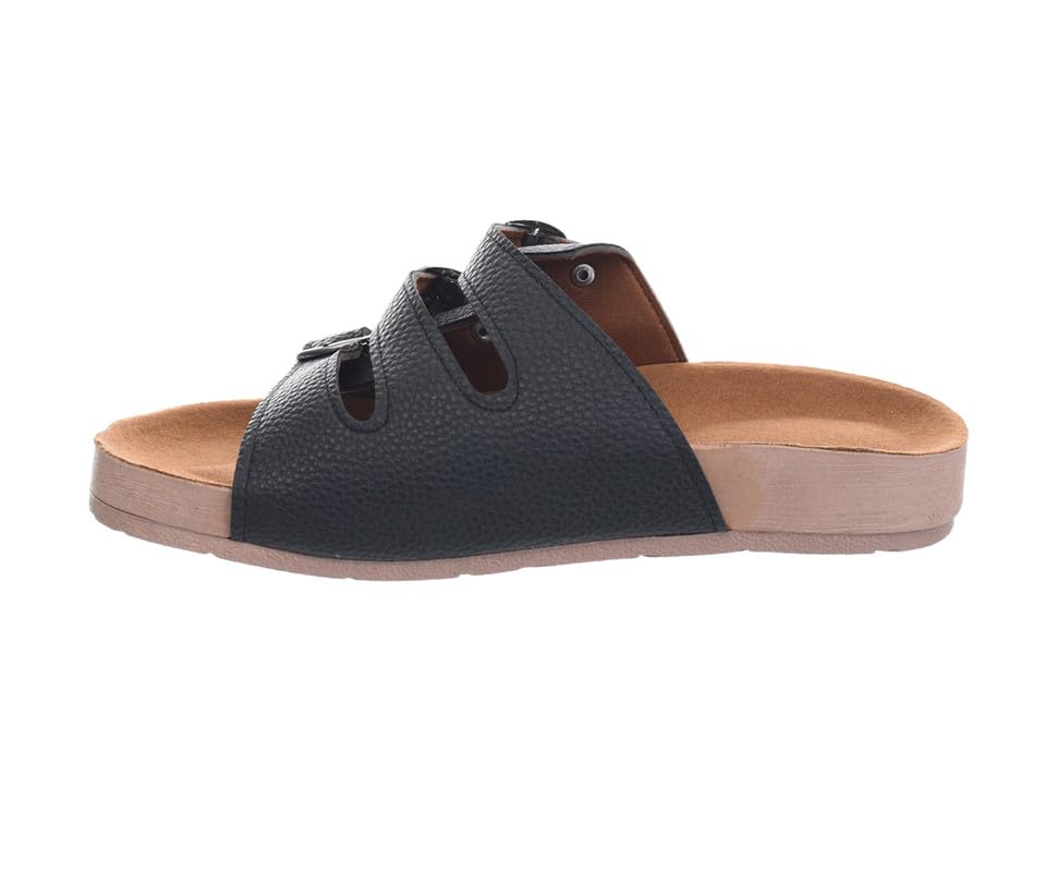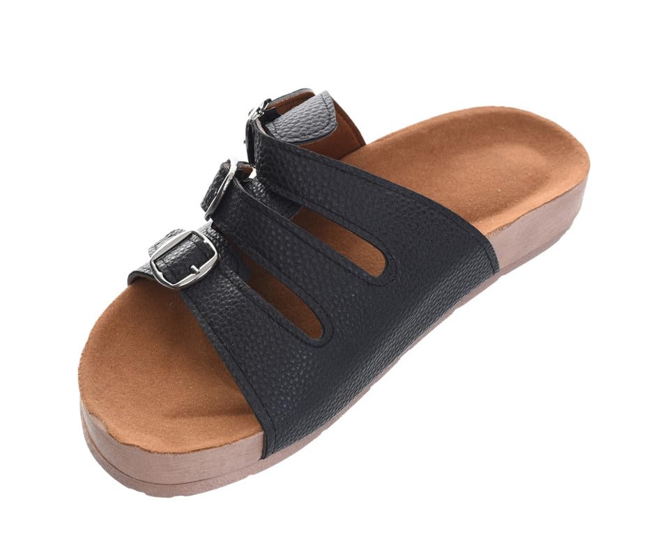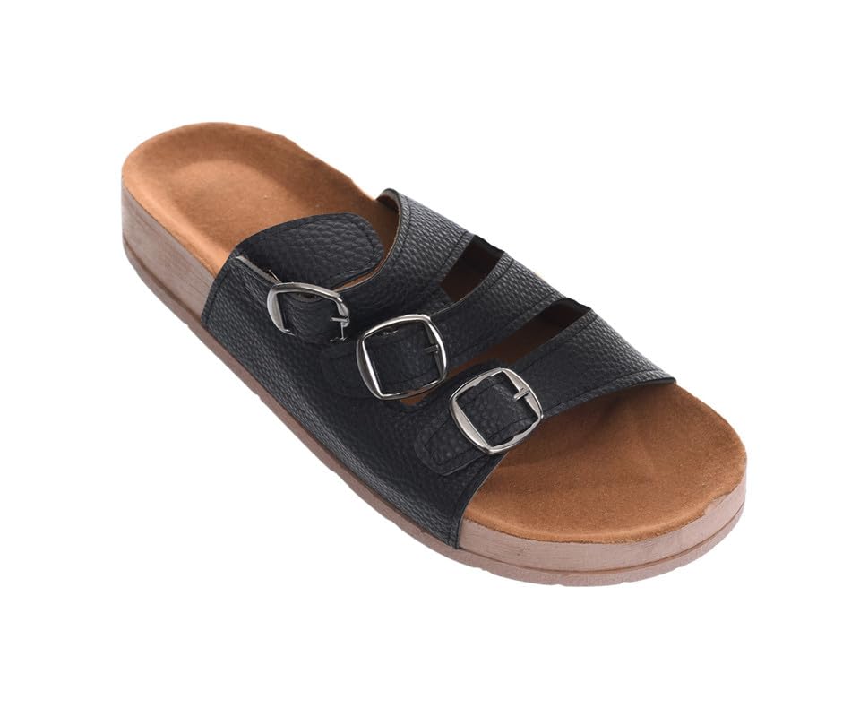 99.99 - 99.99 Women's Flat Leather Slipper With Three Strapes and Buckles