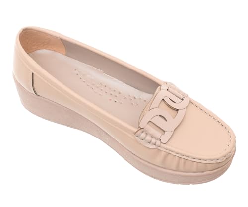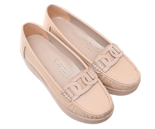 99.99 - 99.99 Women's Leather Shoes with Chunky Block Heel and Front Leather Chain (Beige, 39)