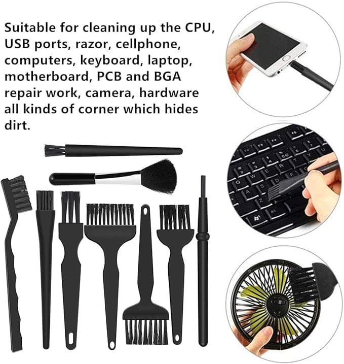- مجموعة تنظيف متعددة الاستخدامات: مجموعة كاملة من 9 قطع من الفرش المضادة للكهرباء الساكنة مصممة لتنظيف الإلكترونيات، بما في ذلك اللوحات الأم ولوحة المفاتيح والكاميرات ومنافذ USB