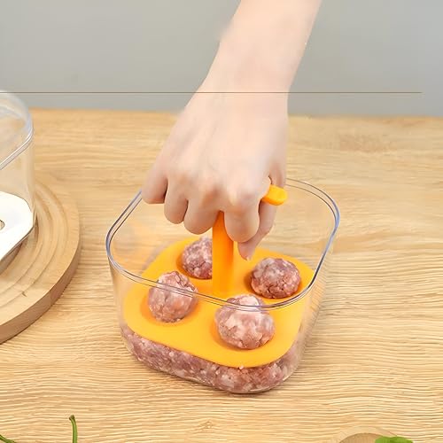 - Manual meatball press mold with a transparent lid, non-stick surface, and outputs 4 evenly sized meatballs per batch.