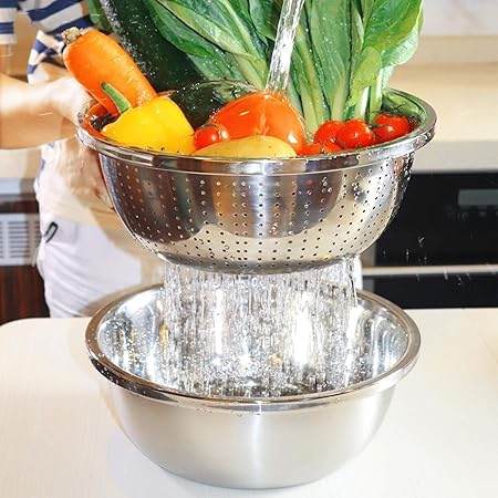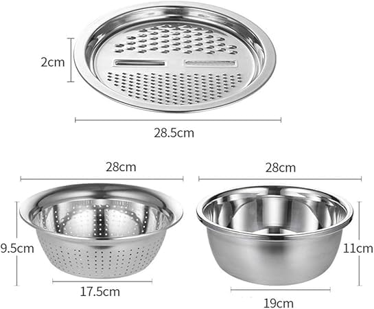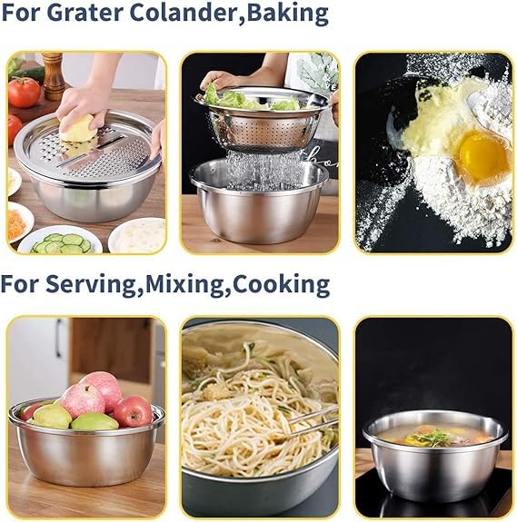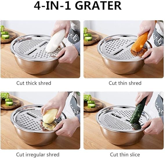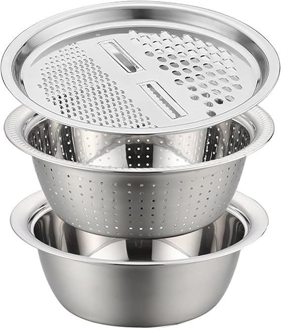 Generic - A versatile stainless steel bowl with a lid, which can be used as a salad mixing bowl, cheese slicer, or colander for washing vegetables, fruits, and rice.