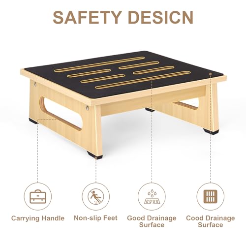 - 【High quality wooden step stool】: safe and portable step stool can help improve the achievable distance, which makes our step stool ideal to get a leg in bedroom, bathroom, kitchen, platform, bed, stair interior steps, stair outdoor steps, bookshelf, old age shower, laundry room or even next to the bed, providing a guarantee for the safety of children and the elderly