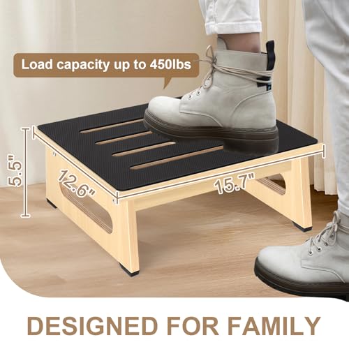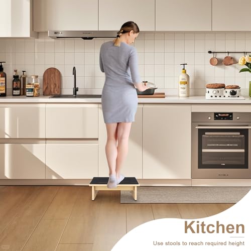 - 【Non-slip tread】: Our wooden step stool has a larger surface area of 15.75 inches x 12.60 inches. It is covered in a non-slip rubber to help reduce slipping when you climb up or down. In addition, and there are anti-slip pads under the stool. which is crucial for children and older safety. Our platform step stool offers a 5.5 inch high support that acts as a step raiser to get to higher levels
