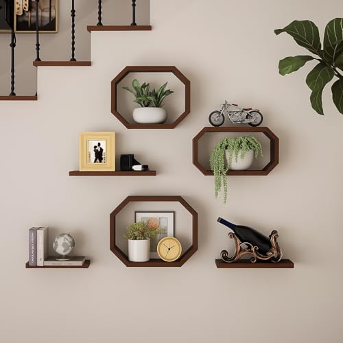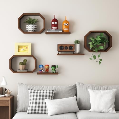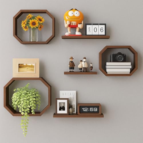 AALIYA MART - Wooden Floating Wall Shelves, Octagonal Shape Set of 6 Wall Shelves | Creative Wall Display Racks for Books, Plants | Decorative Shelf for Living Room, Bedroom, Office (Brown)