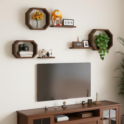 - Space-saving design: Set of 6 creative octagonal wall mounted shelves are perfect for small spaces. They keep your items organized and off the floor, freeing up valuable space in your living room, bedroom, bathroom, kitchen or office.