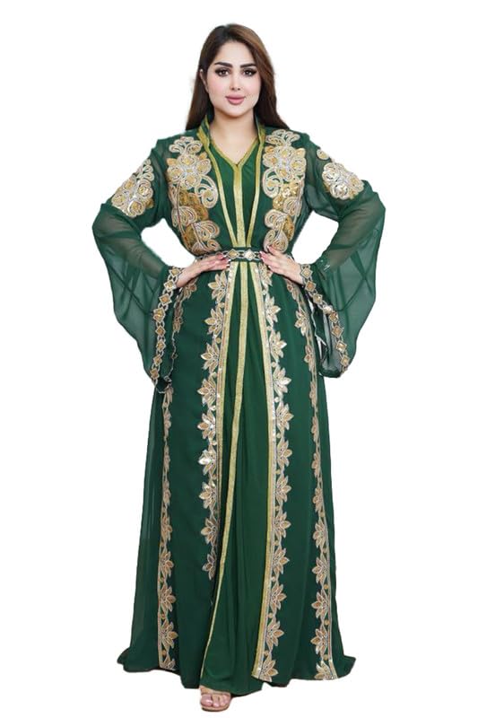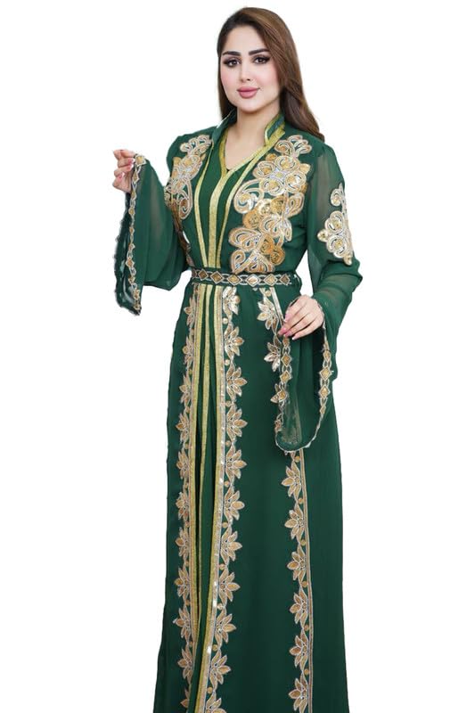 ELASLY Store - Abaya Reception, Material Chiffon, Features Elegant Gold Embroidery, Consists Of 3 Pieces (Abaya, Tebesh, Belt), Model 2081