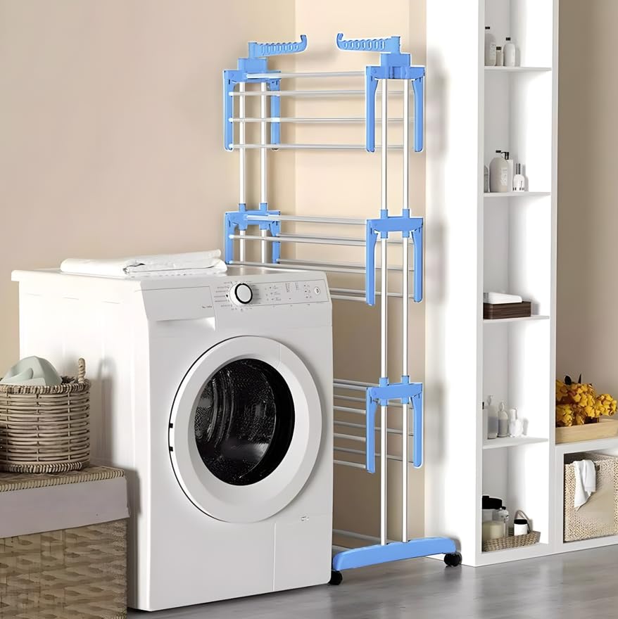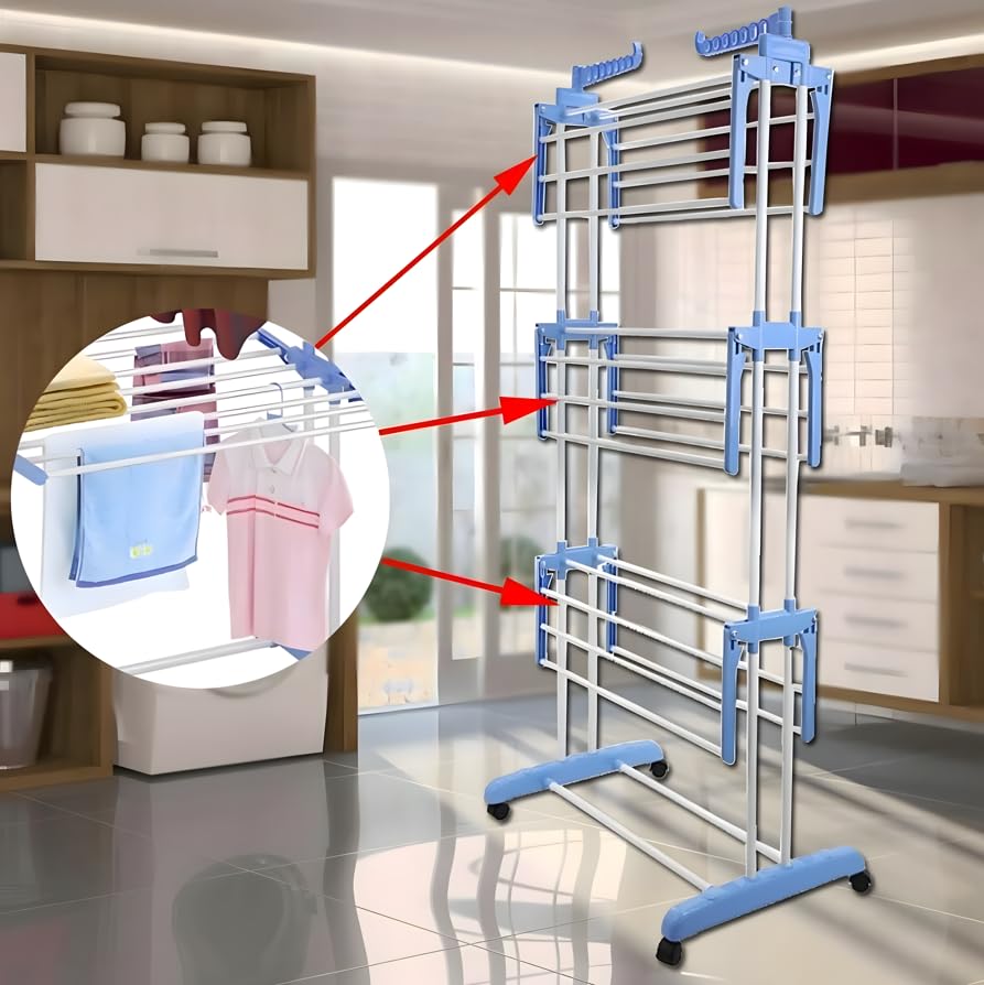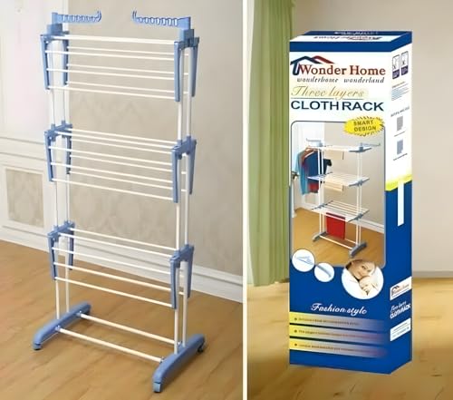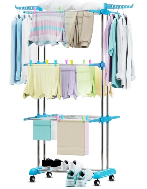 Generic - ABS Stainless Steel Clothes Drying Rack - 3-Tier Foldable Clothes Drying Rack with Wheel for Home/Indoor/Outdoor/Balcony (Cyan + Free 20 Clips Set)