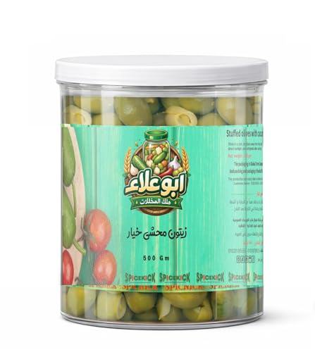 - Stuffed Green Olive: natural green olive filled with crispy cucumber by Abu Ala offers an authentic and distinctive medium flavor